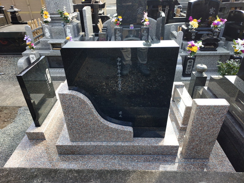 寺院墓地のお墓の建立をさせていただきました。お客様と打合せの中で以前建立させていただいたお墓の施工実例のお墓のデザインを気に入っていただき、新たにデザインを提案させていただきました。緑がかった黒系の石とピンク系の御影石がデザインに合っていて素敵なお墓が完成しました。